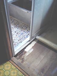2004/5 1畳間の脱衣室にタイルの浴室。 フロアマットをはがしてみると、案の定、脱衣室の床はイカれかかってました。古い物件の水周りには良くある事なので覚悟してました。 後日、サッシと敷居をはがしてイカレ具合を確認しました。 知り合いの大工さんに見てもらいましたが、GOサインが出たので自力で補修を決行する決意! ダメだったらプロに頼もう♪ |
