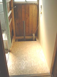 2004/7 正面に作り付けのステンレスの流しが付いてましたが、きっと使いづらいので撤去しました。 給排水があるので、洗濯&脱衣室として活用する事に。 マットをはがして、フローリングもはがして、断熱材も根太も取り払い、壁紙と石膏ボードもはがしたところで柱の一部もイカれてる事が判明。 柱一本取り替えるのは無理なので、イカれてる部分を掻き出し、防腐処理をして新材を継ぎ足しました。 床下もブロックで補強して、新しい根太を渡します。 床下には防湿消臭の為に薫炭を撒きました。 |
