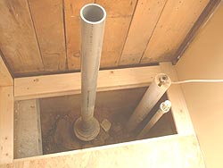2004/7 給排水の様子。 真冬の凍結防止にサーモ付きの電熱線を巻きました。 水道の元栓がココにあるので、塞いでしまわずパカッと開けられる構造にします。 排水管は床を完成させてからカットします。 この上に調度、洗濯機が乗る予定。 |