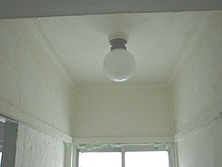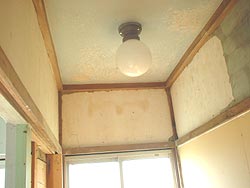 2004/7 天井はまだこんな感じ。 レトロな電球の笠が可愛いので、これに似合う内装を考えましょう。 お風呂の戸、どうしようかしら…。 |